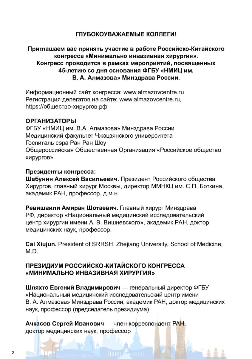 С приветственными словами выступили президент Российского общества хирургов, главный хирург Москвы, директор ГБУЗ «ММНКЦ им. С.П. Боткина ДЗМ», академик РАН Шабунин Алексей Васильевич и главный хирург и эндоскопист Минздрава РФ, генеральный директор ФГБУ «НМИЦ хирургии им. А.В. Вишневского» Минздрава России, академик РАН Ревишвили Амиран Шотаевич. Присутствующих также поприветствовали консул по науке и технологиям генерального консульства Китайской Народной Республики в Санкт-Петербурге Чжао Вэй, консул по образованию генерального консульства Китайской Народной Республики в Санкт-Петербурге Ма Сяодии и президент Общероссийской общественной организации «Общество эндоскопических хирургов России», член-корреспондент РАН Емельянов Сергей Иванович. Участникам мероприятия также передали приветственный адрес председателя Законодательного собрания Санкт-Петербурга Александра Николаевича Бельского.