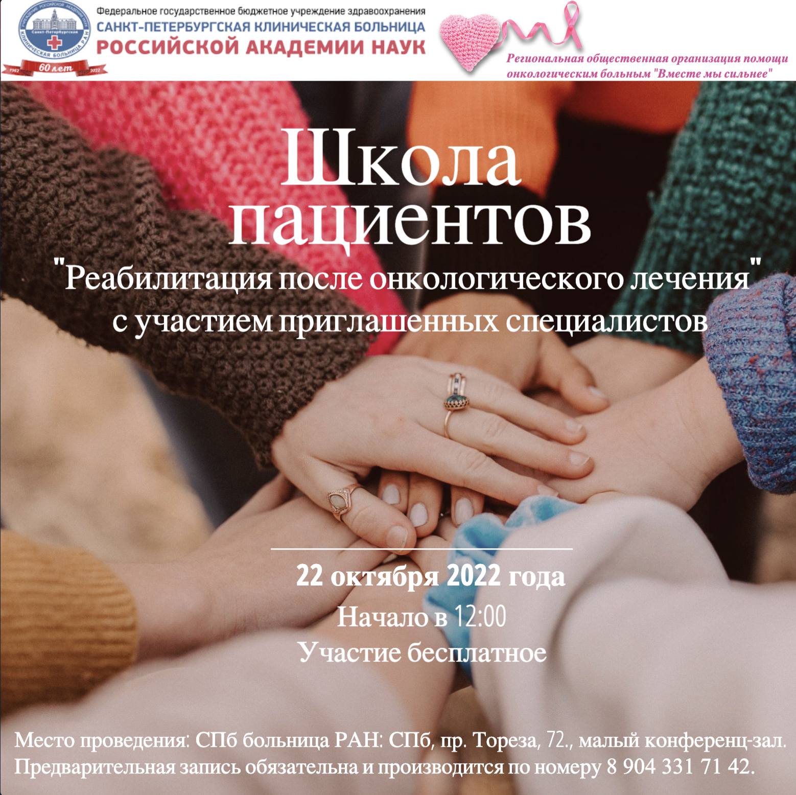 Уже в эту субботу, 22 октября 2022 года в 12:00 на базе Федеральное государственное бюджетное учреждение здравоохранения «Санкт-Петербургская клиническая больница Российской академии наук» (СПб больница РАН) состоится первая «Школа пациентов», посвящённая вопросам реабилитации вовремя и после специализированного онкологического лечения.