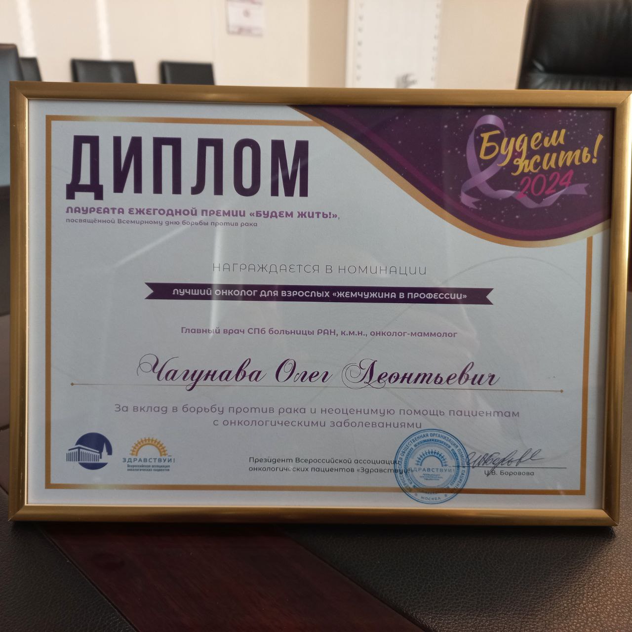 Главный врач Санкт-Петербургской клинической больницы Российской академии наук Олег Леонтьевич ЧАГУНАВА стал победителем в номинации «Жемчужина в профессии» - Лучший онколог для взрослых.