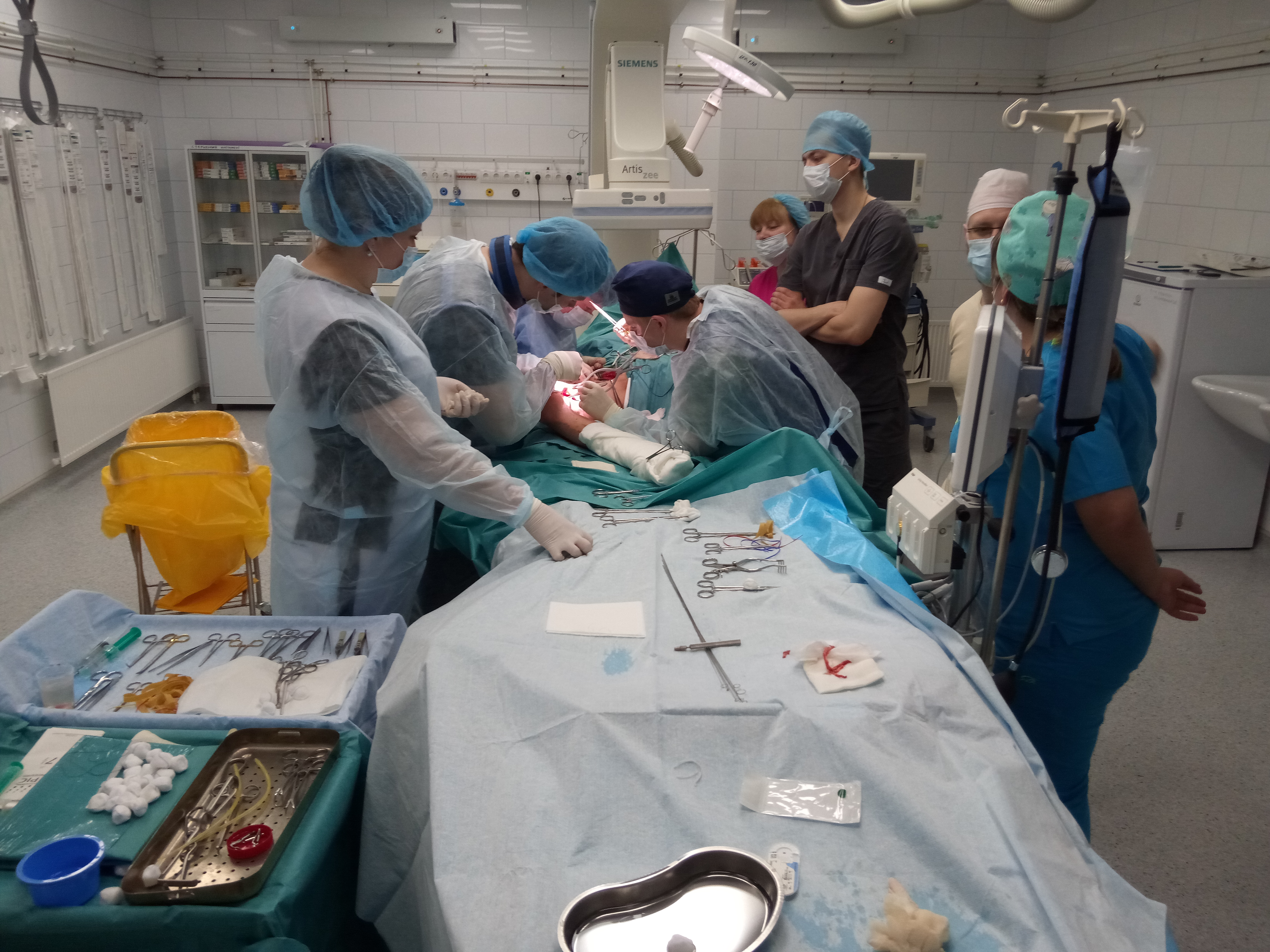 19 мая 2017 года в клинике, в отделении рентген-эндоваскулярной хирургии выполнена первая «гибридная операция». Под крышей операционного театра отделения одномоментно трудились три бригады врачей: анестезиологи, сосудистые хирурги и эндоваскулярные хирурги. Пациенту был поставлен диагноз «критическая ишемия нижней конечности, диабетическая стопа». Как метод лечения пациенту было предложено выполнить крупное опреративное вмешательство, а именно, - аорто-бедренное и бедренно-подколенное шунтирование. Однако данное хирургическое лечение не было выполнено. Буквально на грани потери конечности пациент попал в руки наших специалистов. Операция прошла успешно.: одноэтапно была выполнена петлевая эндартрэктомия в бедренной артерии и имплантирован стент в общую подвздошную артерию. Послеоперационное течение прошло гладко, пациент чувствует себя прекрасно.